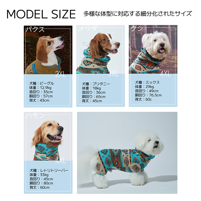 サイズは平置きで採寸した数値です。ワンちゃんの体型や毛量により、着用感に差が出る場合があります。
