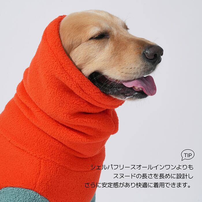 スヌード一体型のデザインで、耳と首まですっぽり包み込み、
