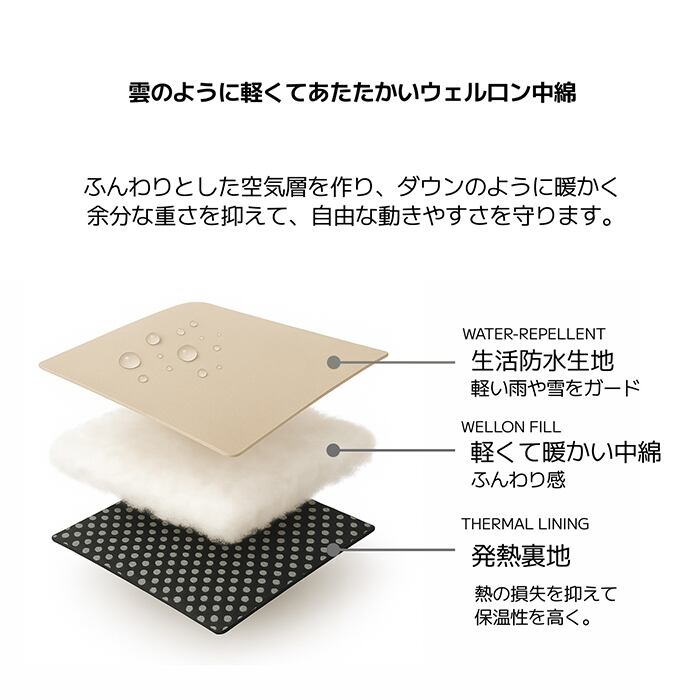 中綿には、ダウンのように軽くてあたたかいウェルロン中綿を採用。