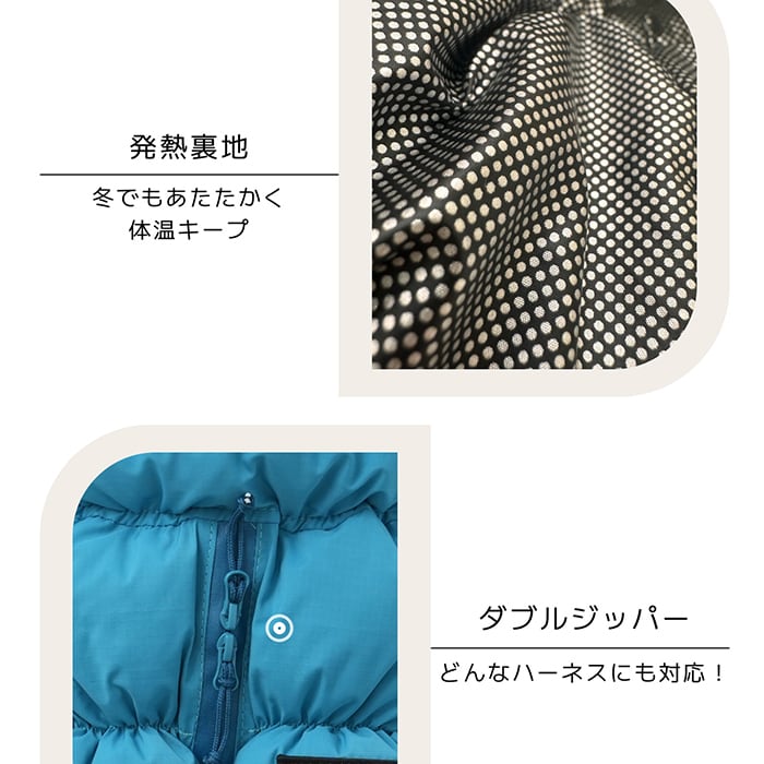さらに、発熱裏地が体温を逃さずキープし、寒い日のお散歩でもしっかり保温します。
