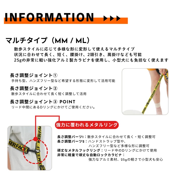 幅2.5cm・長さ1.5〜2.5m調節可能・重さ約25g の多用途リードです。