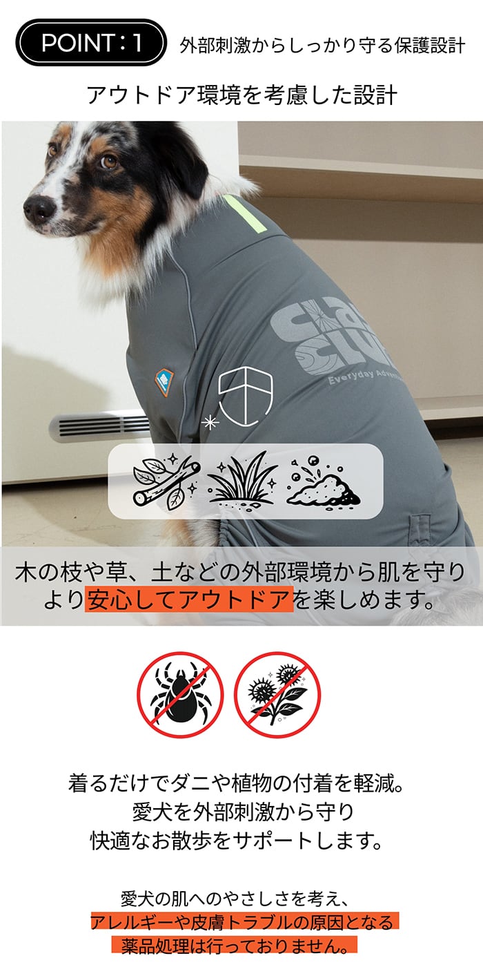 草・枝・ホコリ・虫などの付着を軽減し、被毛や皮膚を保護